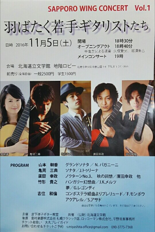 毎年恒例?のポエティカ!!! ギターが本当に素直に響いてくれる、滅多にない場所です。 演奏ではなく、ポエティカ目当てで来る人もいます(笑) 予約制なので、電話かメールでお願い致します。 たまぁぁぁに満席になるので、当日来ても入れない場合があります(笑) そして、実力派ギタリスト達に混ぜていただいて大変光栄なコンサート! これだけのメンツが揃えば素晴らしいコンサートになるでしょう(*^^*) チケットは僕でもチラシ記載でも大丈夫です。 「アクアレル」いい曲です!僕が弾くわけではありませんが…(笑)