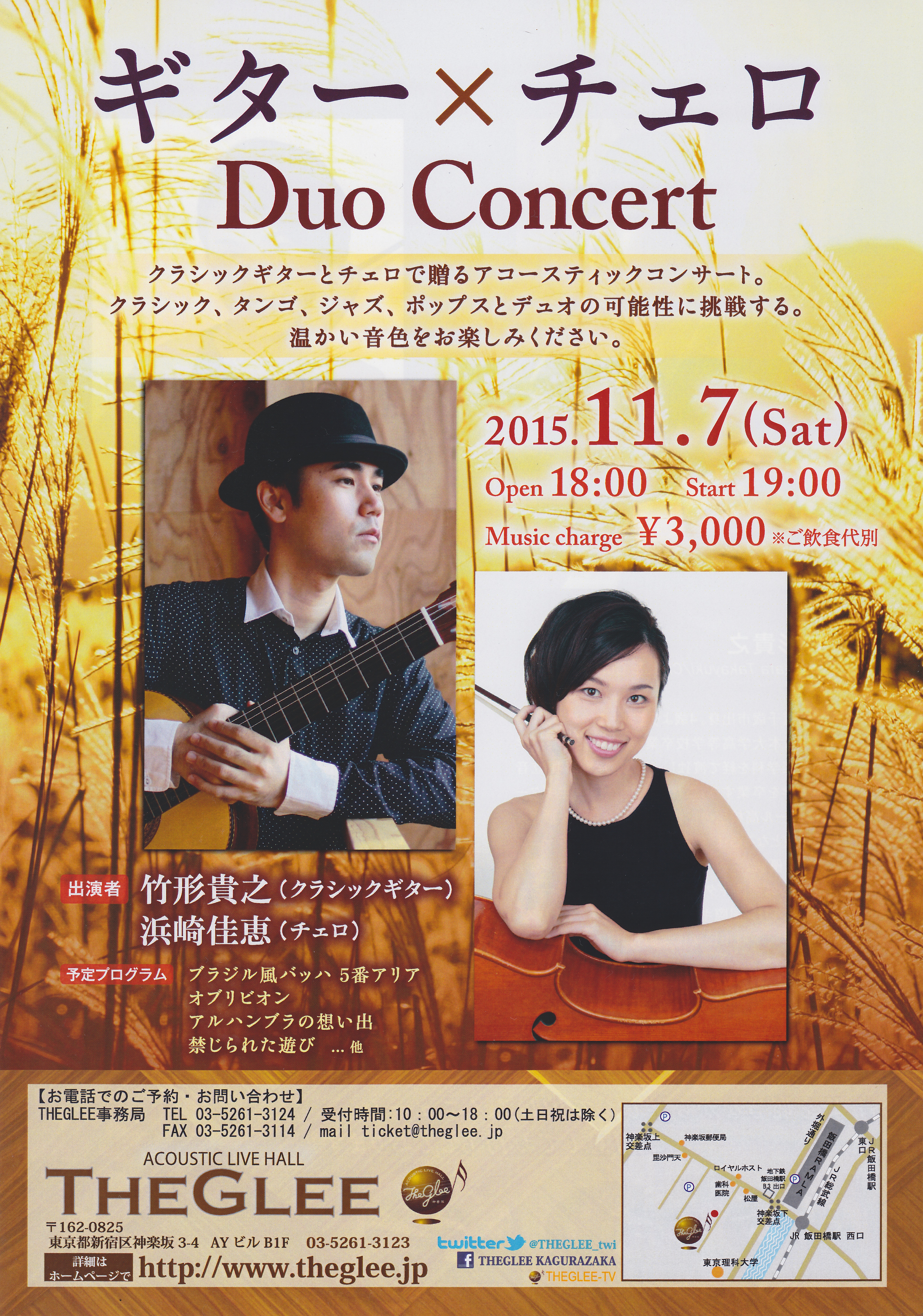 11月7日(土)、東京の神楽坂の「THE GREE」というところで、チェロとギターのコラボ。たくさんの人に楽しんでいただこうと、幅広いジャンルの選曲です!チェロも素晴らしいし、超お勧めです(^^)v