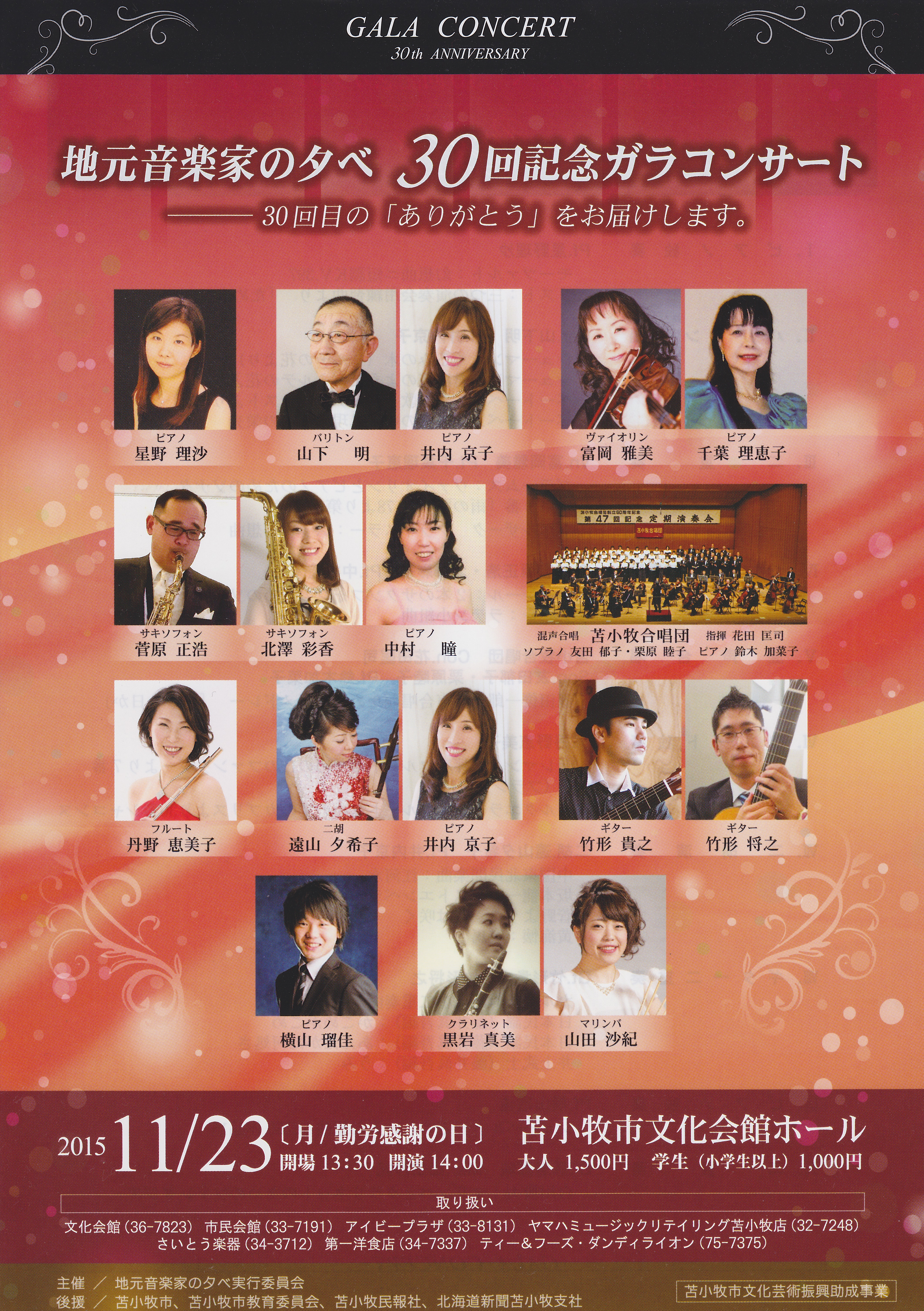 11月23日(月・祝)、見ての通りたくさんの楽器が出演します!楽しんでいただけるコンサートだと思います♪題名のない音楽会などに出ている有名な人もいるんですよ~(*^^*)