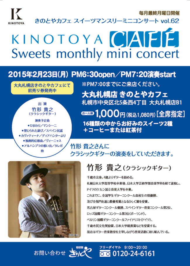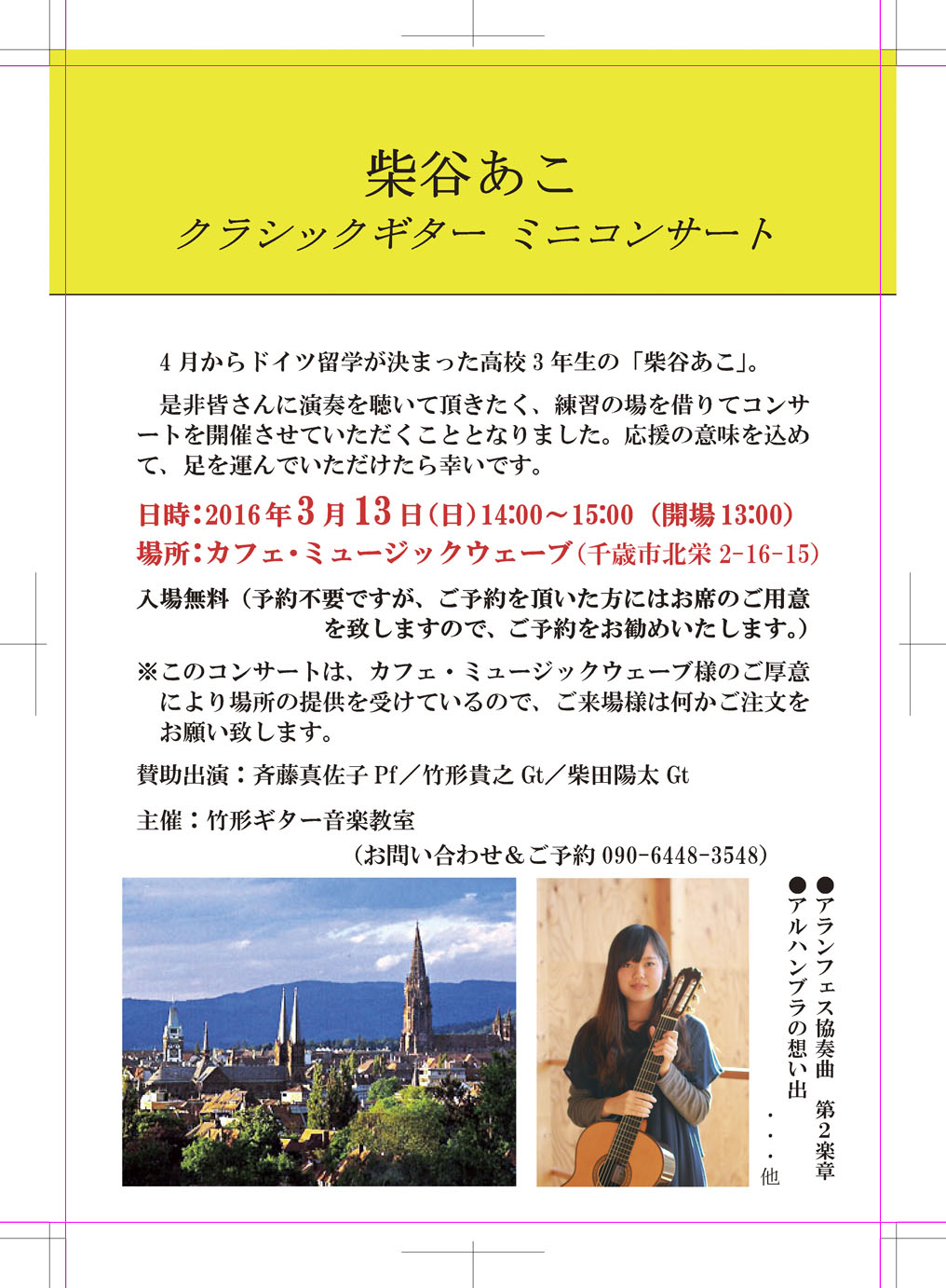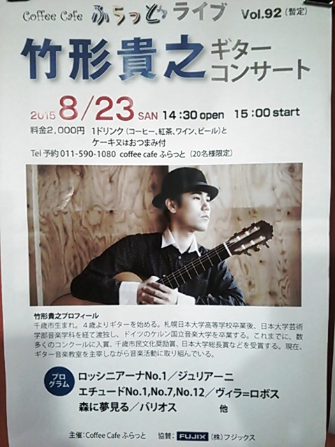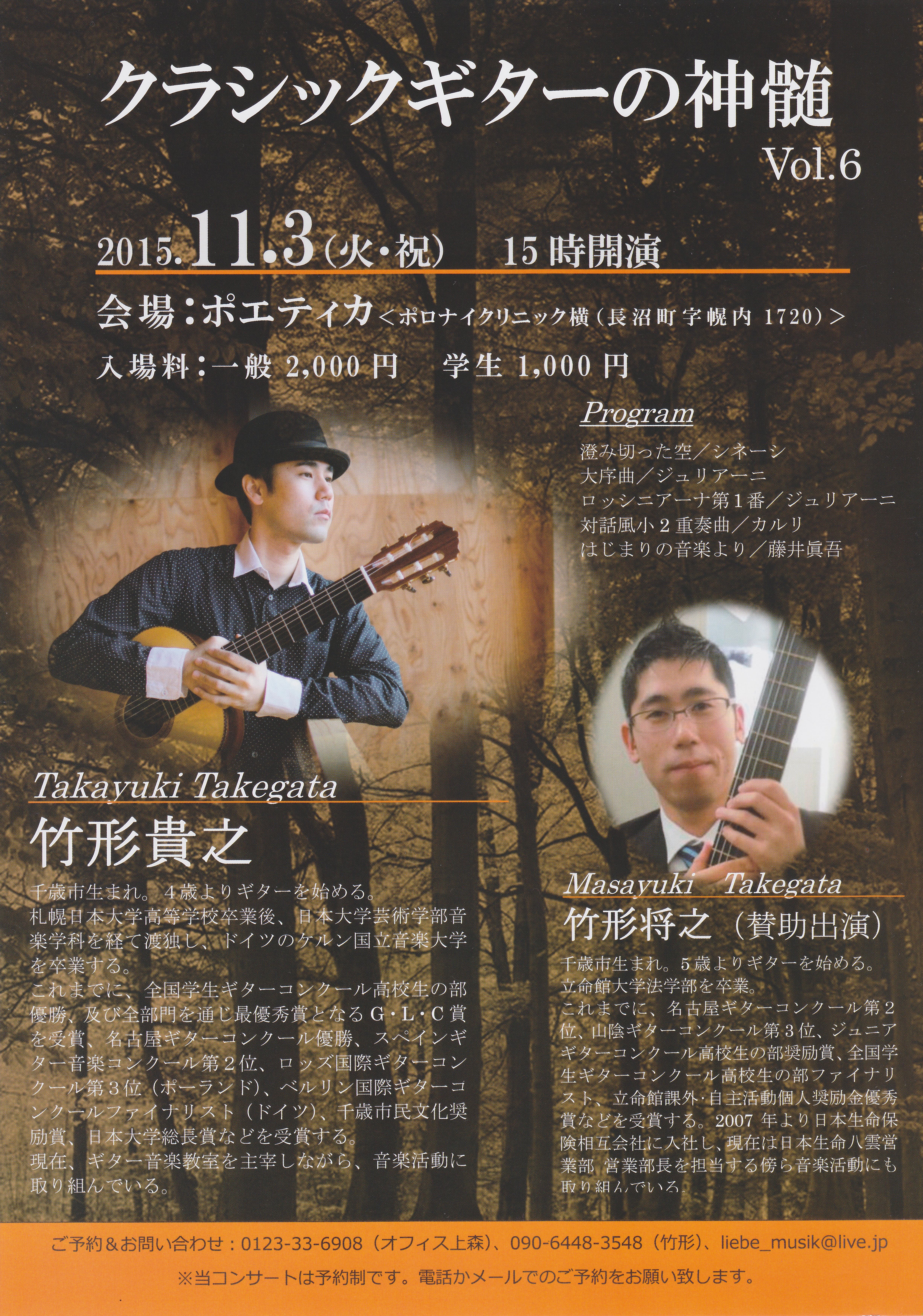 こんにちは!寒くなってきましたね。北海道の今日は暖かいですが、匂いが冬のような感じがします。チラシの出来上がっているコンサートの告知をさせていただきます。10月31日(土)、千歳市立図書館で朗読とギターのコラボ。なかなか楽しいですよ(^^)無料ですが整理券が必要なので、直接図書館に行くか、僕に言っていただいてもOKです! 11月3日(火・祝)は毎年恒例の「クラシックギターの神髄」。予約制で、嬉しいことに毎年たくさんの方に来ていただいています。当日来ていただいても入れない場合があるので、電話かメールでの予約をお願い致します。